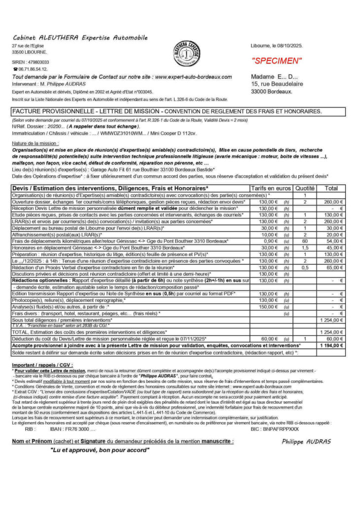 Spécimen Devis n°1 : Lettre de Mission : Assistance et conseil avant achat d’un véhicule, à inspecté sur pont élévateur et/ou au sol en présence de l’acheteur et du vendeur. Formule complète ou à la carte, exemple de tarif : 437 euros (voir détails ci-dessous ou via ce lien).