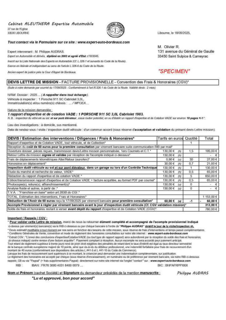 Spécimen Devis n°1 : Lettre de Mission : Assistance et conseil avant achat d’un véhicule, à inspecté sur pont élévateur et/ou au sol en présence de l’acheteur et du vendeur. Formule complète ou à la carte.